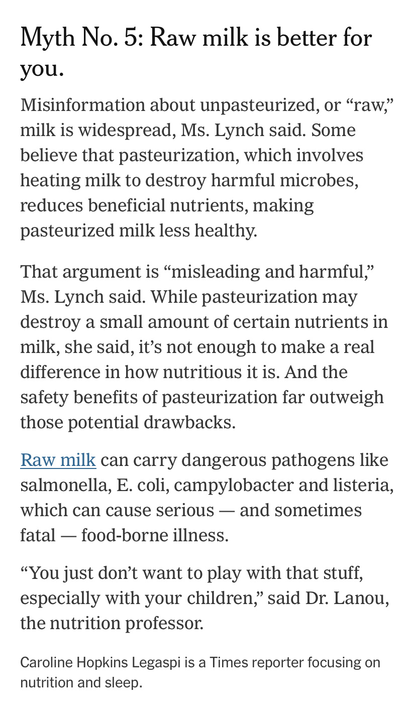 From the misinformation upside down world, basically everything in this article is wrong. I know most people know that, that the cultures that did grow up on raw milk, probably are intolerant to pasteurized.